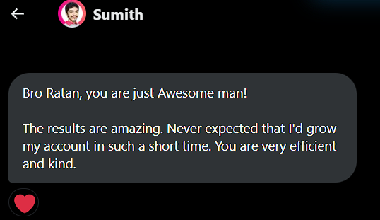 "Bro Ratan, you are just awesome, man! The results are amazing. Never expected that I'd grow my account in such a short time. You are very efficient and kind."
